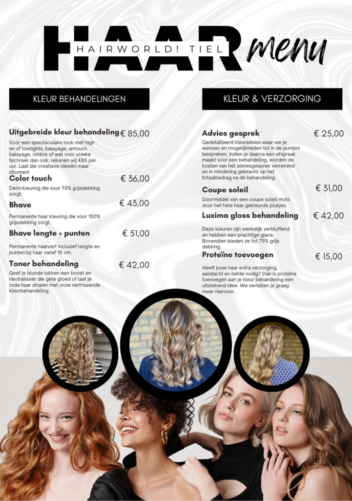 € 99.50Voor een spectaculaire look met high en/of lowlights, balayage, airtouch balayage, ombre of wat voor unieke techniek ook rekenen wij € 99.50 per uur. Laat die creatieve ideeën maar stromen!UurtariefBhave